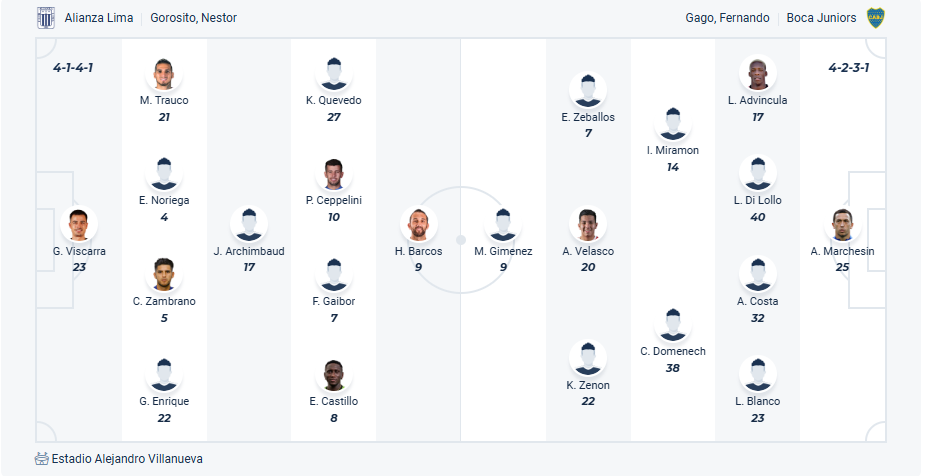 Boca Juniors là đội bóng rất nổi tiếng của Argentina, họ từng nhiều lần vô địch quốc gia lẫn Copa Libertadores. Tuy nhiên việc chỉ đứng thứ 6 mùa giải trước khiến đội bóng của HLV Fernando Gago phải dự vòng loại của giải đấu này năm nay. Với chất lượng đội hình đang có thì Boca Juniors được đánh giá rất cao trong các trận đấu của mình. Các cầu thủ Boca Juniors muốn có một kết quả tốt trong trận đấu lượt đi khi làm khách trên sân của Alianza Lima, với đội hình được đánh giá cao hơn và nhiều kinh nghiệm hơn thì nhiều khả năng đội bóng Argentina sẽ có chiến thắng ra về.