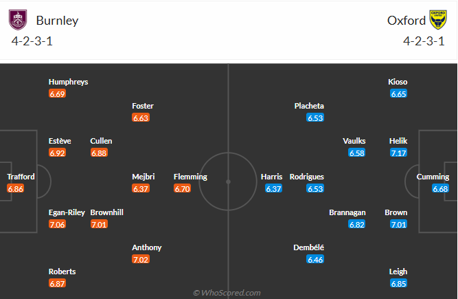 Oxford không phải đội bóng mạnh của Championship, mùa trước họ còn đá ở League One và mới thăng hạn mùa giải này. Rõ ràng mục tiêu của thầy trò HLV Gary Rowett sẽ chỉ là trụ hạng và họ đang làm tốt nhiệm vụ đó với vị trí thứ 16 ở thời điểm hiện tại. Oxford bất bại trong 6 vòng gần nhất nên rất tự tin khi đến làm khách trên sân của Burnley. Tuy nhiên trước đối thủ mạnh hơn nhiều thì sự tự tin đó là chưa đủ, nhiều khả năng Oxford sẽ không làm được gì nhiều và phải nhận thất bại trận này.