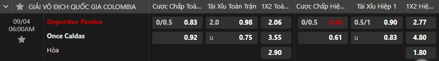 Tỷ lệ kèo Deportivo Pereira vs Once Caldas