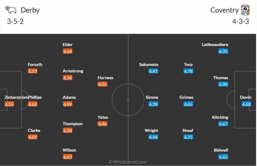 Derby County đang chơi tệ mùa giải này, với vị trí thứ 22 hiện tại thì họ sẽ bị xuống hạng vào cuối mùa nếu không làm tốt hơn trong phần còn lại của mùa giải. Chiến thắng ở vòng đấu trước là không đủ và Derby County cần tiếp tục giành chiến thắng ở vòng đấu thứ 36 này để nuôi hy vọng trụ hạng. Tuy nhiên đối thủ của họ lại là đội bóng có phong độ cực cao Coventry nên mọi thứ sẽ rất khó khăn. Nhiều khả năng dù đã chơi cố gắng như Derby County vẫn sẽ phải nhận thất bại trận này.