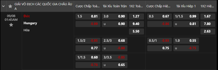 Tỷ lệ kèo Đức vs Hungary