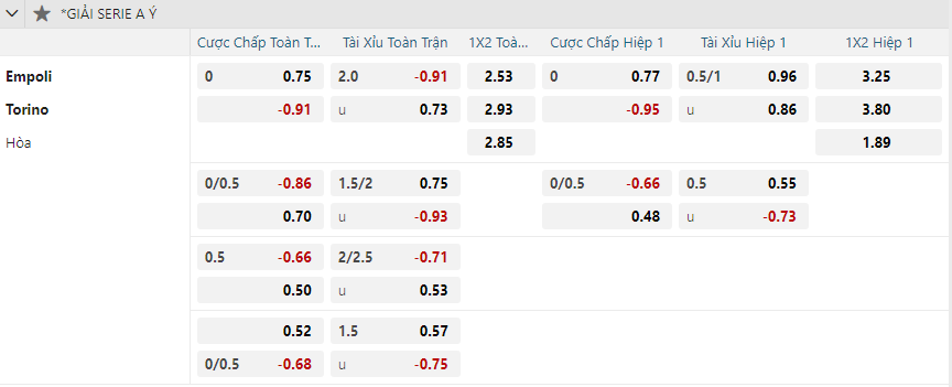 Soi kèo tài xỉu Empoli vs Torino: 0.71*2.25*0.53