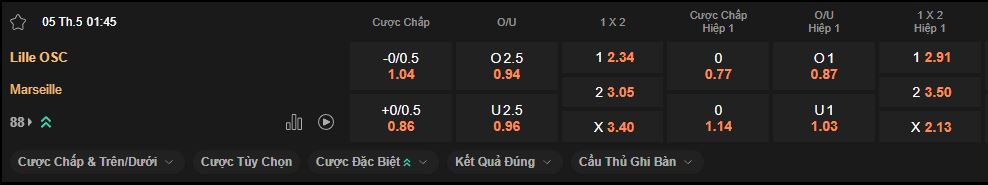 Với lợi thế về mặt sân bãi, Lille tự tin dâng cao tấn công ngay từ những phút đầu tiên của hiệp 1. Mặc dù vậy, với phong độ vượt trội nhiều khả năng đội khách Marseille sẽ có được bàn thắng ngay trong hiệp đấu này. Chính vì vậy, giới chuyên môn khuyên người chơi lựa chọn đội khách để thu lời.