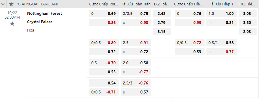 Soi kèo châu Á Nottingham Forest vs Crystal Palace