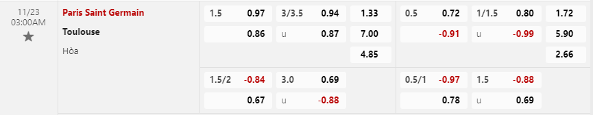 Soi kèo châu Á Paris Saint-Germain vs Toulouse: 0.84*1.75*0.67