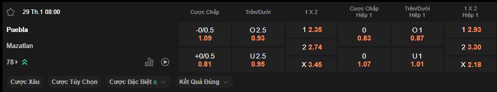 Với lợi thế sân bãi, Puebla sẽ dâng cao tấn công ngay từ những phút đầu tiên của hiệp 1. Với phong độ vượt trội nhiều khả năng Mazatlan sẽ giành được 1 bàn thắng trong hiệp 1. Chính vì vậy, giới chuyên môn khuyên người chơi nên chọn Mazatlan trong hiệp 1 trận đấu này.