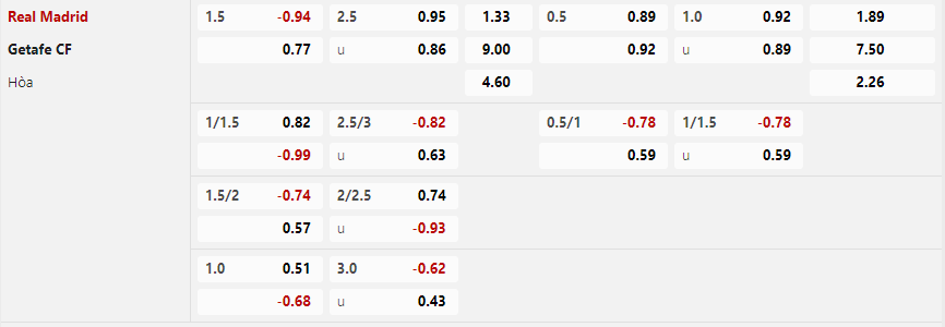 Soi kèo tài xỉu Real Madrid vs Getafe: 0.62*3.0*0.43