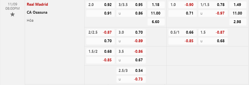Soi kèo hiệp 1 Real Madrid vs Osasuna: 0.90*1.0*0.71