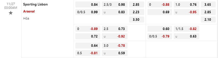 Soi kèo châu Á Sporting Lisbon vs Arsenal: 0.64*-0.5*0.81