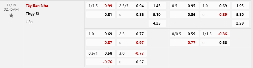 Soi kèo châu Á Tây Ban Nha vs Thụy Sĩ: 0.99*1.25*0.81