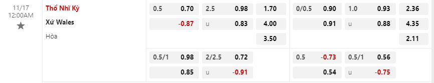 Soi kèo tài xỉu Thổ Nhĩ Kỳ vs Wales: 0.91*2.25*0.72